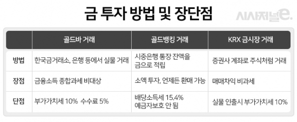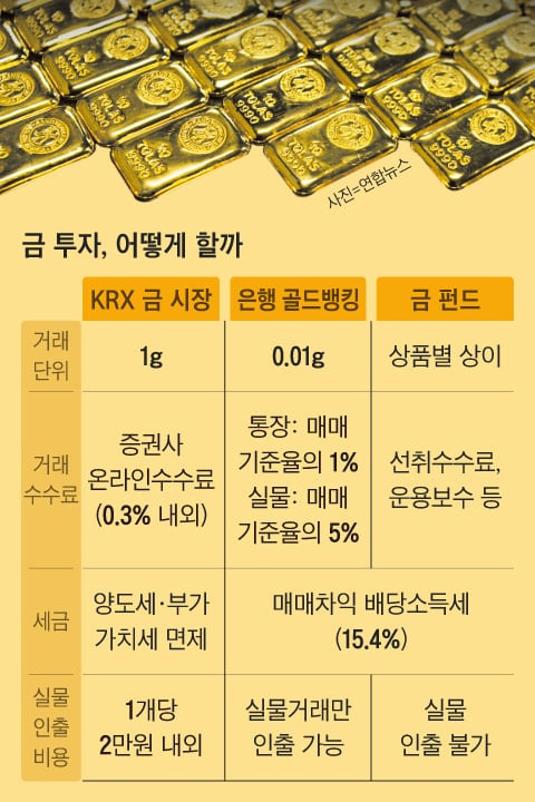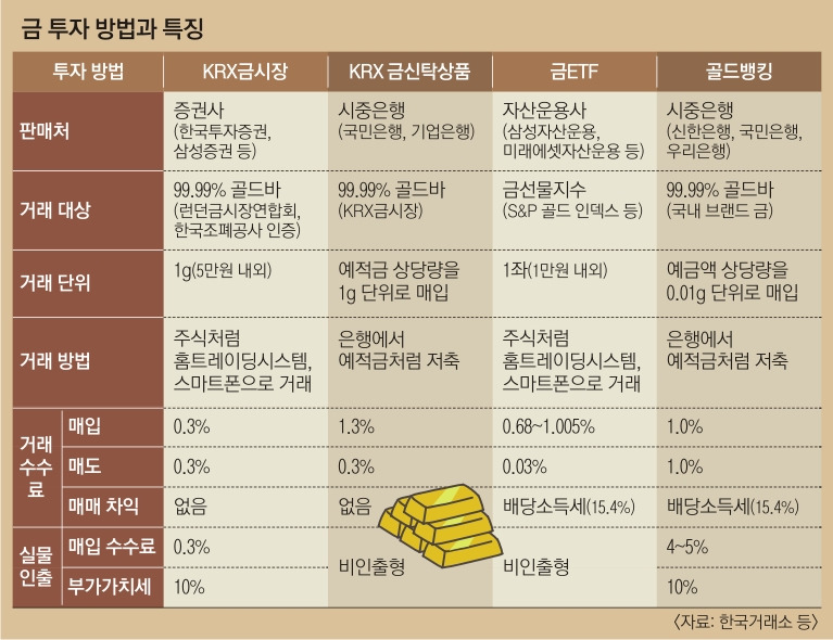 - KRX 금 시장 : 한국거래소에서 운영하는 금 거래 시장으로, 금 현물 거래가 가능합니다. 거래 단위는 1g이며, 온라인 거래 시 0.3%의 수수료가 부과됩니다.