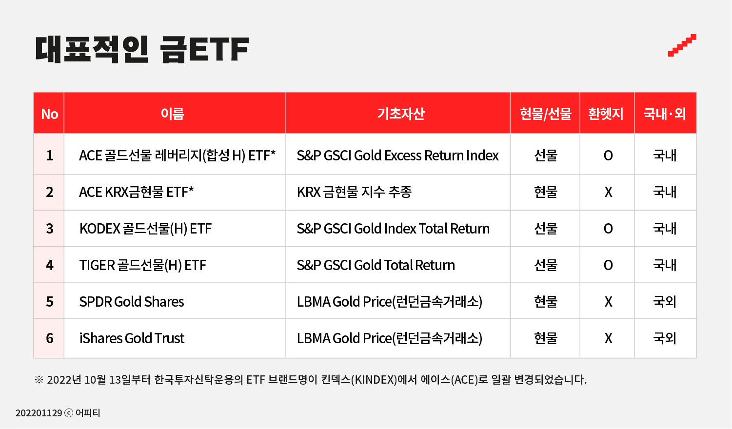 금 ETF는 금에 투자하는 또 다른 방법으로, 주식처럼 거래소에서 거래됩니다. 금 ETF는 금 가격에 연동되어 움직이며, 다양한 종류가 존재합니다. 대표적인 금 ETF로는 ACE Gold Futures Leveraged ETF, KODEX Gold Futures ETF 등이 있습니다. 금 ETF는 소액으로도 투자할 수 있어 많은 투자자들에게 인기가 높습니다.