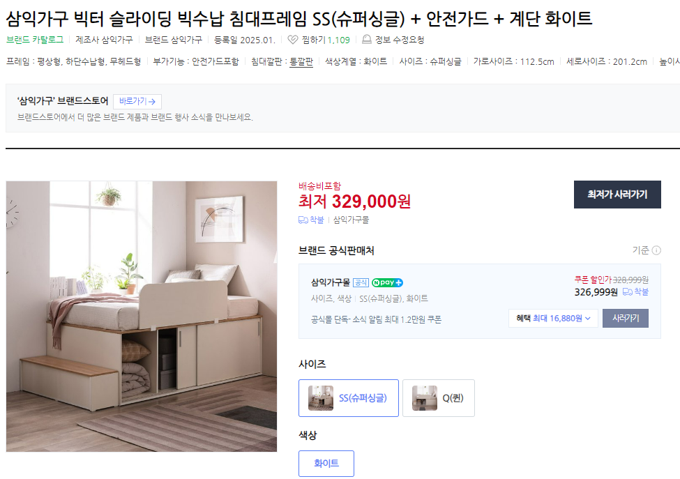 C . 삼익가구 빅터 슬라이딩 빅수납 침대 프레임 + 안전가드 + 계단 화이트